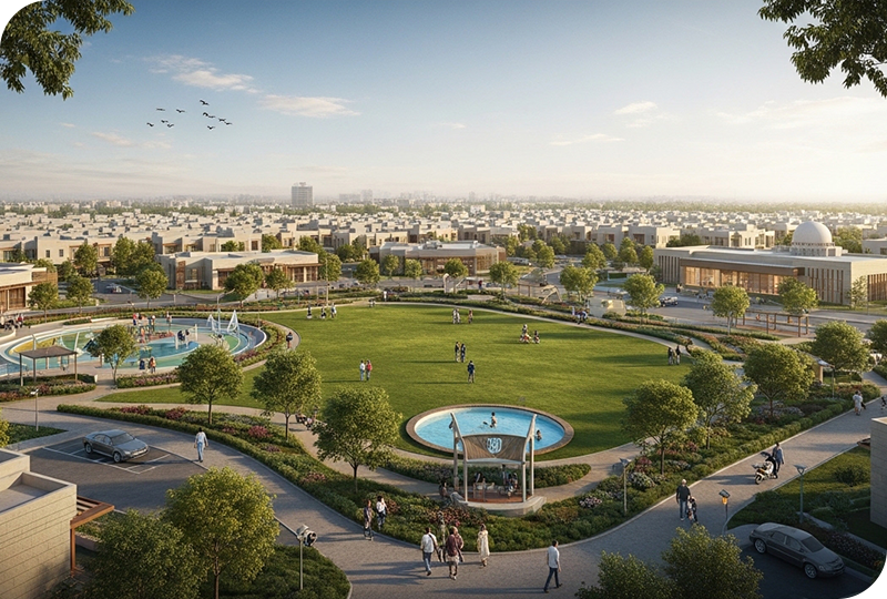 The master plan outlines specific zones for residential, commercial, recreational, and green spaces, ensuring a balanced and organized developmen.